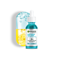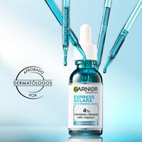 Garnier Express Aclara Anti Imperfecciones Sérum Booster 4% [Ácido salicílico, Niacinamida, AHA, Vitamina C*]. Eficacia clínica: Anti-imperfecciones y Anti-Puntos negros. Clínicamente probado: reduce imperfecciones en un -44%1 y los puntos negros en un -90%2, reduce poros y uniformiza la piel.